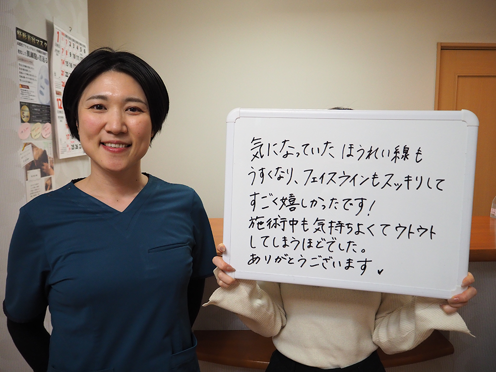 鍼は痛いイメージがありましたが、少ない本数で施術できるところが魅力的だなと思いました。痛みはとても少なくびっくりしました。1回目の施術後、家族に顔小さくなったねと言われとても嬉しかったです。お肌のハリもでて化粧ノリも良いです。これからも続けていきたいなと思いました!
