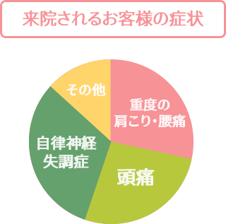 重度の肩こり・腰痛をはじめ、頭痛・坐骨神経痛・自律神経失調症・O脚などでお悩みの方が多くご利用されています。